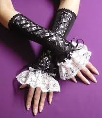 I think GLOVES (also known as ARMWARMERS or GAUNTLETS depending on lenght and shape) are a must-have in every goth's closet. I own 4 or 5 pairs ! xD I love long ones, with all the laces but also cute little net ones !! It was Queen Elisabeth I too make them super-fashionable in the 16th century wearing them to every occasion to draw attention to her beautiful hands! She would have her gloves decorated with jewels.